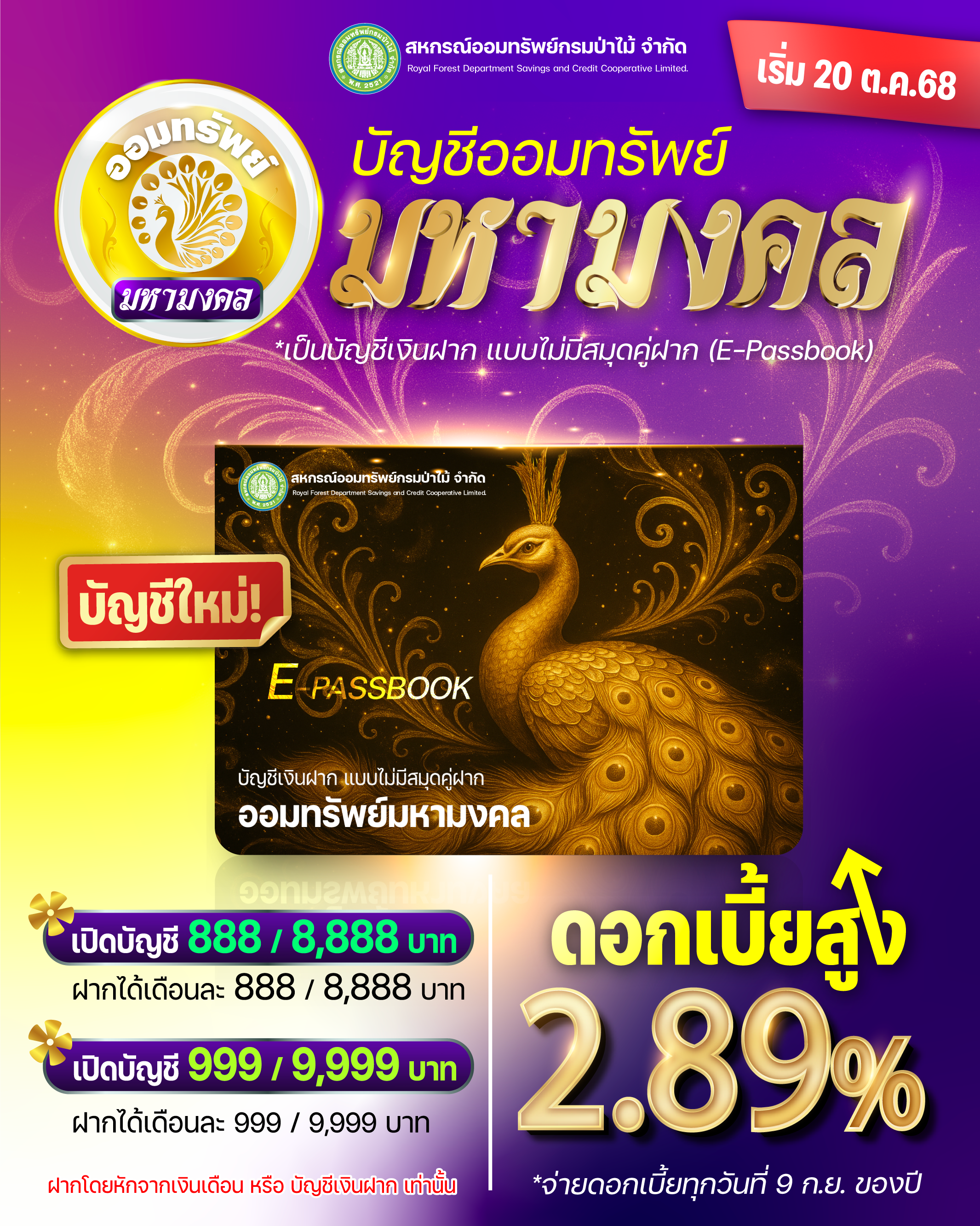 สหกรณ์ออมทรัพย์กรมป่าไม้ จำกัด ได้กำหนดระเบียบสหกรณ์ออมทรัพย์กรมป่าไม้ จำกัด ว่าด้วยการรับเงินฝาก พ.ศ. 2568 ลงวันที่ 15 กันยายน 2568 กำหนดให้มีบัญชีเงินฝากออมทรัพย์มหามงคล เพื่อส่งเสริมให้สมาชิกและสมาชิกสมทบมีการออมอย่างต่อเนื่อง ตระหนักถึงความสำคัญแห่งการประหยัดอดออม และสร้างความมั่นคงทางการเงินในอนาคต เพื่อพัฒนาคุณภาพชีวิตของสมาชิก และสมาชิกสมทบ