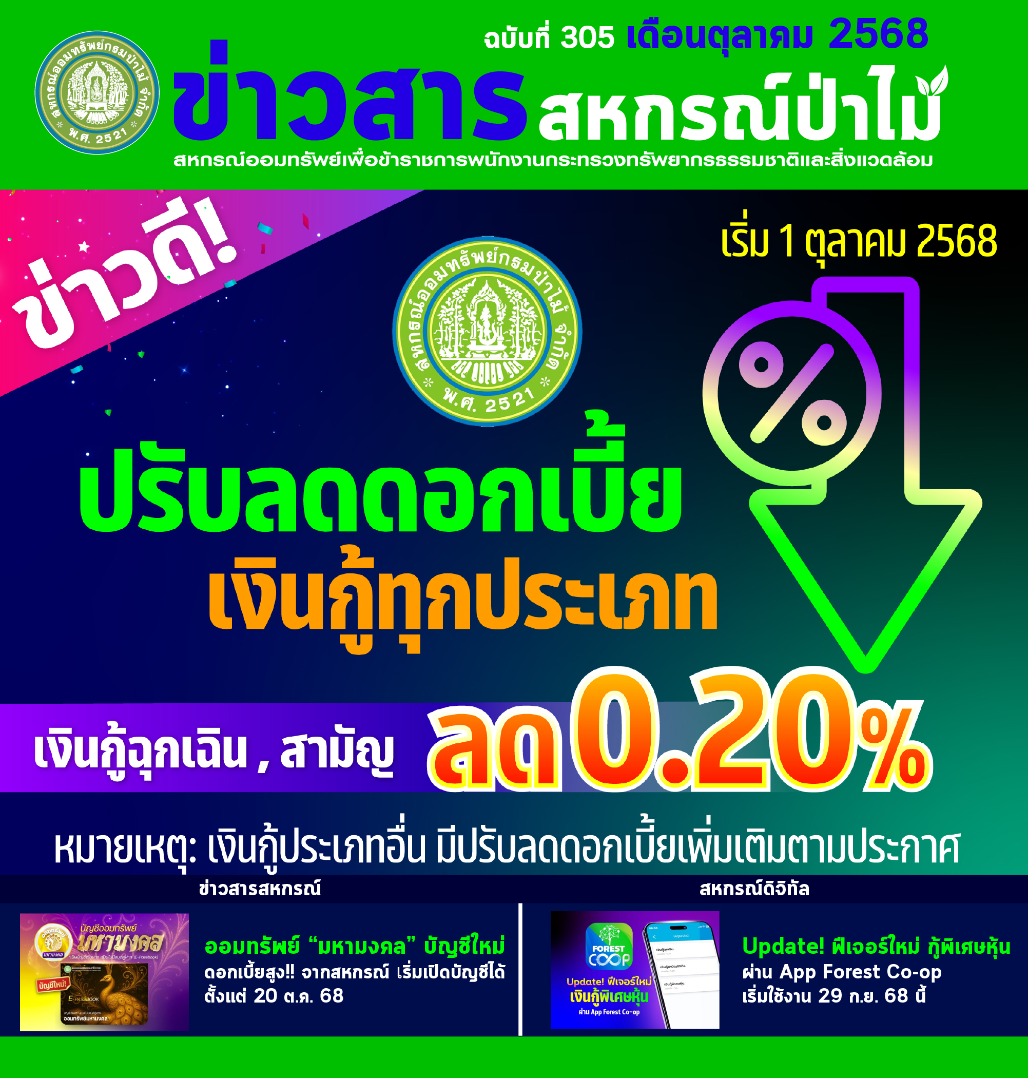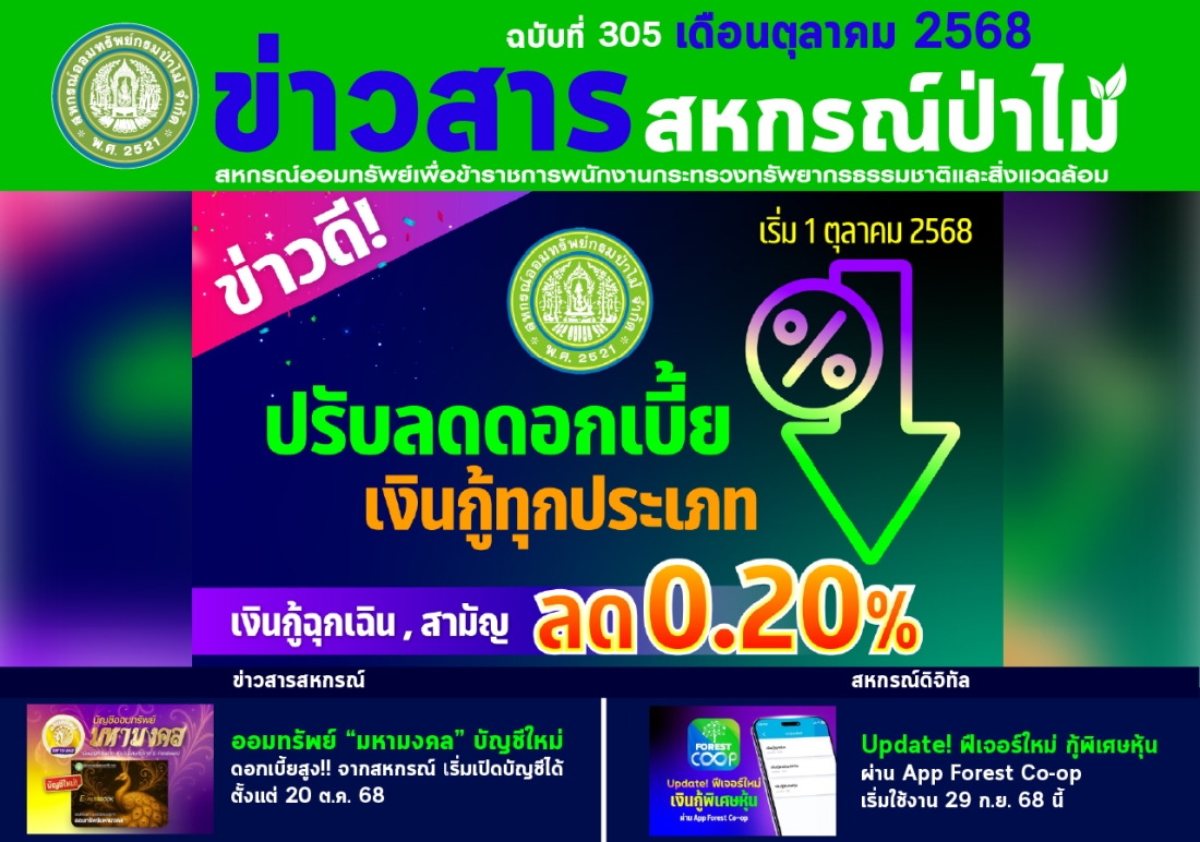 สหกรณ์ออมทรัพย์กรมป่าไม้ จำกัด ขอเชิญชวนสมาชิกทุกท่านมาร่วมเป็นส่วนหนึ่งของสังคมแห่งการออม โดยสหกรณ์ได้จัดกิจกรรมวันออมแห่งชาติ 68 ออมเงินกับสหกรณ์ ลุ้นรับรางวัลมากมาย ในระหว่างวันที่ 20-31 ต.ค.68 โดยในปีนี้พิเศษกว่าเดิมกับการเปิดตัวบัญชีออมทรัพย์ประเภทใหม่ บัญชีออมทรัพย์ “มหามงคล” เป็นบัญชีอิเล็กทรอนิกส์ที่ไม่มีสมุดคู่ฝาก นอกจากลวดลายและเลขมงคลของบัญชี ยังให้ดอกเบี้ยสูงอีกด้วย อ่านรายละเอียดเพิ่มเติม