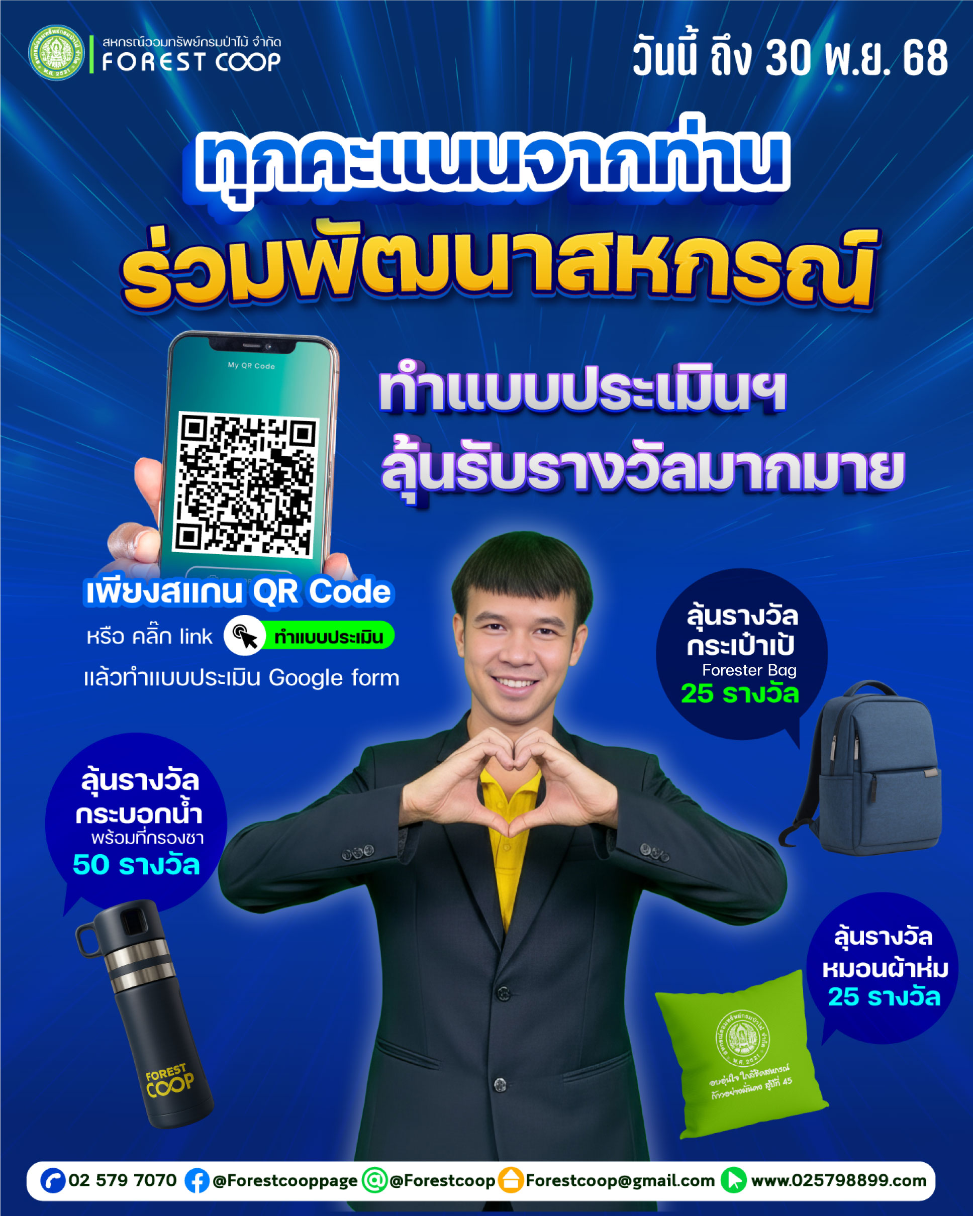 เป็นแบบประเมิน online ที่สมาชิกและสมาชิกสมทบ สามารถร่วมกันทำแบบประเมินการให้บริการ ได้ผ่าน Google Form คลิ๊กทำแบบประเมิน สมาชิกและสมาชิกสมทบสามารถร่วมตอบแบบสอบถามความพึงพอใจ ได้ตั้งแต่วันนี้ ถึง 30 พ.ย. 68 พร้อมลุ้นรับของรางวัลมากมาย อาทิเช่น กระบอกน้ำพร้อมที่กรองชา , กระเป๋าเป้ Forester Bag , หมอนผ้าห่ม รวมของรางวัลกว่า 100 รางวัล