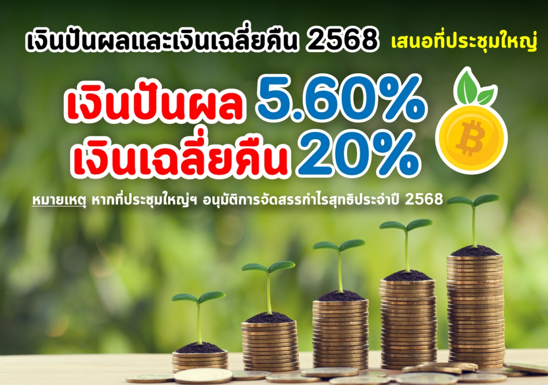 และหากที่ประชุมใหญ่สามัญประจำปี อนุมัติการจัดสรรกำไรสุทธิประจำปีแล้ว สมาชิกจะสามารถเบิกถอนเงินปันผล - เงินเฉลี่ยคืน ได้ในวันอาทิตย์ที่ 15 กุมภาพันธ์ 2569 ตั้งแต่เวลาประมาณ 18.00 น. เป็นต้นไป