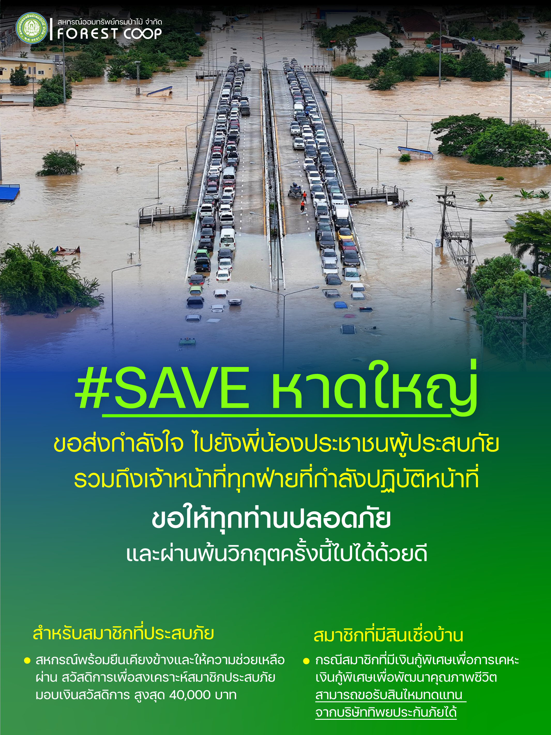 จากสถานการณ์น้ำท่วมในพื้นที่หาดใหญ่ ซึ่งสร้างความเสียหายต่อที่อยู่อาศัยและทรัพย์สินของประชาชนจำนวนมาก สหกรณ์ออมทรัพย์กรมป่าไม้ จำกัด ขอแจ้งสิทธิ์ที่สมาชิกสามารถยื่นขอได้ ทั้งในส่วนของ สวัสดิการเพื่อสงเคราะห์สมาชิกประสบภัยของสหกรณ์ และ สิทธิประโยชน์จากประกันอัคคีภัยอาคารพักอาศัย ของบริษัททิพยประกันภัย จำกัด (มหาชน) สำหรับผู้ที่มีสินเชื่อบ้าน เพื่อให้สมาชิกได้รับการบรรเทาความเดือดร้อนอย่างทั่วถึง