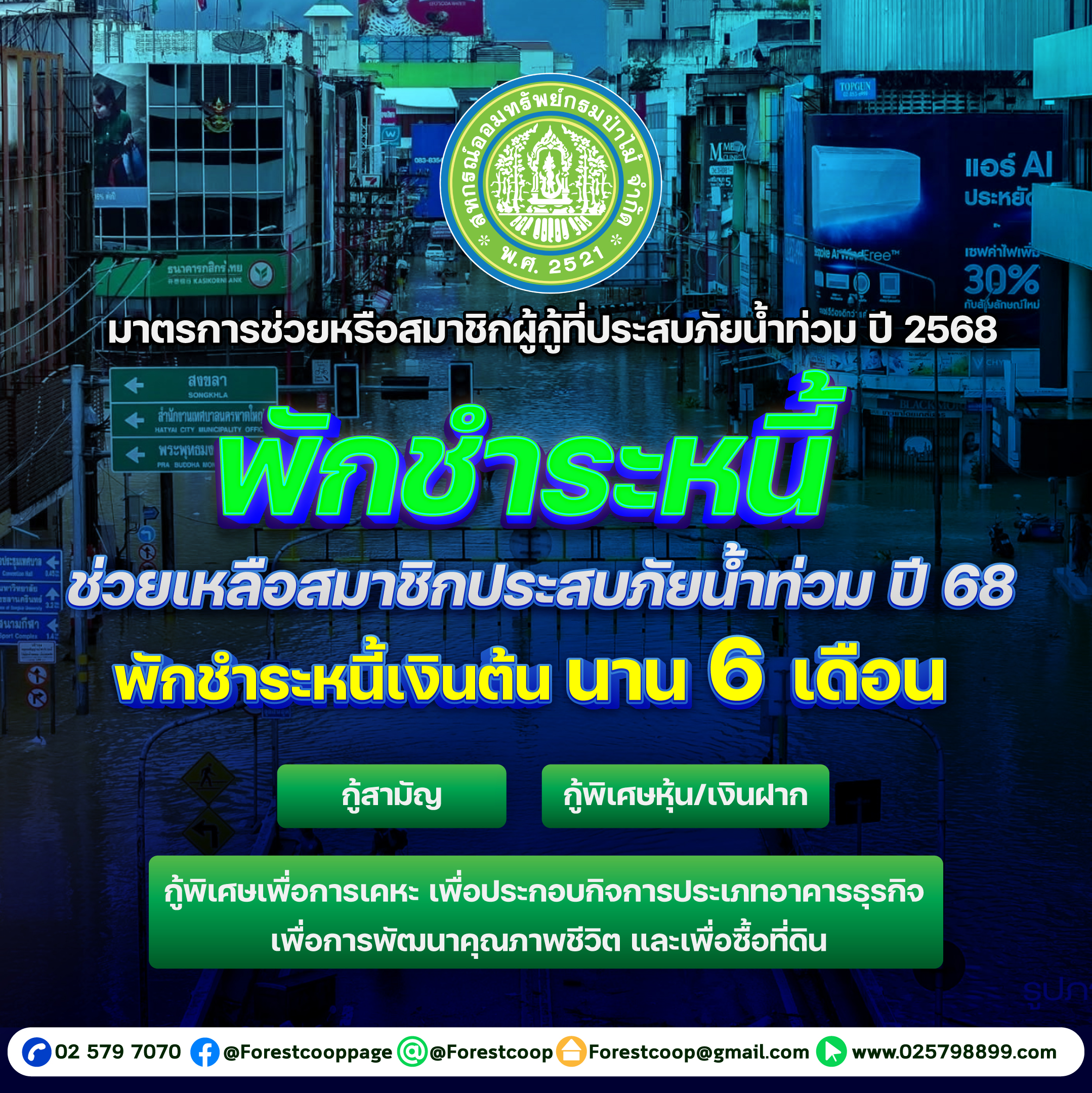 ตามที่เกิดสถานการณ์อุทกภัย (น้ำท่วม) ในหลายพื้นที่ ซึ่งส่งผลกระทบต่อสมาชิกได้รับความเดือดร้อน ทรัพย์สินได้รับความเสียหาย และกระทบต่อการดำรงชีพ ซึ่งสหกรณ์ออมทรัพย์กรมป่าไม้ จำกัด ได้กำหนดระเบียบสหกรณ์ฯ ว่าด้วยการให้เงินกู้แก่สมาชิกสหกรณ์ พ.ศ. 2568 ข้อ 56 เงินงวดชำระหนี้จะต้องไม่เกินเงินได้รายเดือนของผู้กู้ ข้อ 56.3 วรรคสี่ และข้อ 56.4 วรรคสาม โดยมีสาระสำคัญ “สมาชิกสามารถขอผ่อนผันงดการชำระเงินต้นเงินกู้ได้”