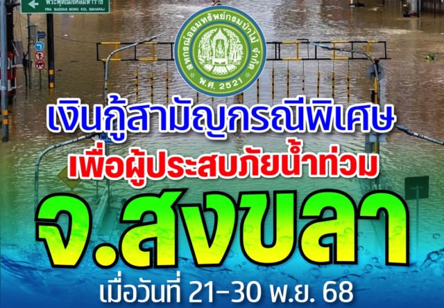ดูทั้งหมดเงินกู้สามัญเพื่อสงเคราะห์ผู้ประสบภัยพิบัติน้ำท่วม จ.สงขลา