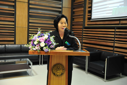 นางสาวอารยา บุญยะศิรินันท์ ประธานกรรมการดำเนินการ สอ.ปม. กล่าวรายงานต่อท่านประธานในพิธี