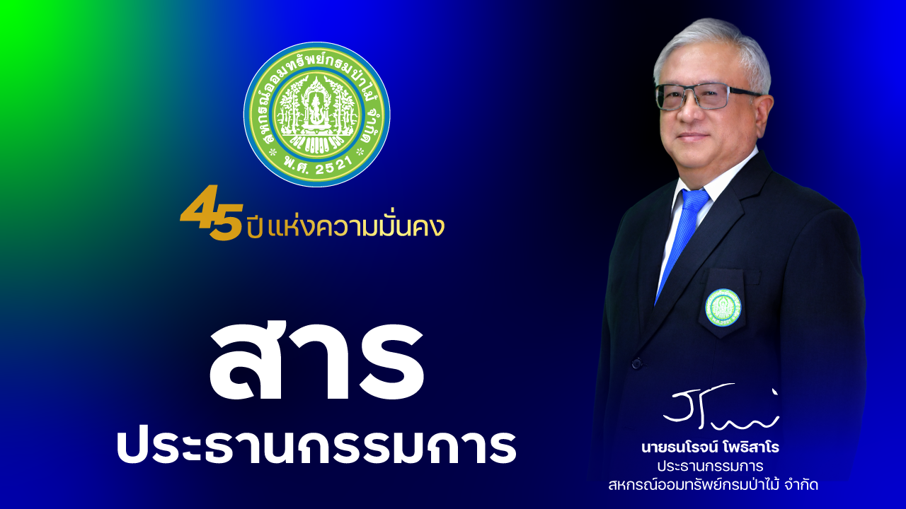 สวัสดีครับ...ท่านสมาชิกสหกรณ์ออมทรัพย์กรมป่าไม้ จำกัด ทุกท่าน ในโอกาสวันคล้ายวันก่อตั้งสหกรณ์ออมทรัพย์กรมป่าไม้ จำกัด วันที่ ๒๘ กันยายน ๒๕๖๖ ซึ่งครบรอบ ๔๕ ปี ที่สหกรณ์ออมทรัพย์กรมป่าไม้ จำกัด ของพวกเรา ได้ดำเนินงานมาตั้งแต่ปี พ.ศ. ๒๕๒๑ จนถึงปัจจุบัน ผ่านการบริหารจัดการ ยุคต่าง ๆ ดังนี้
