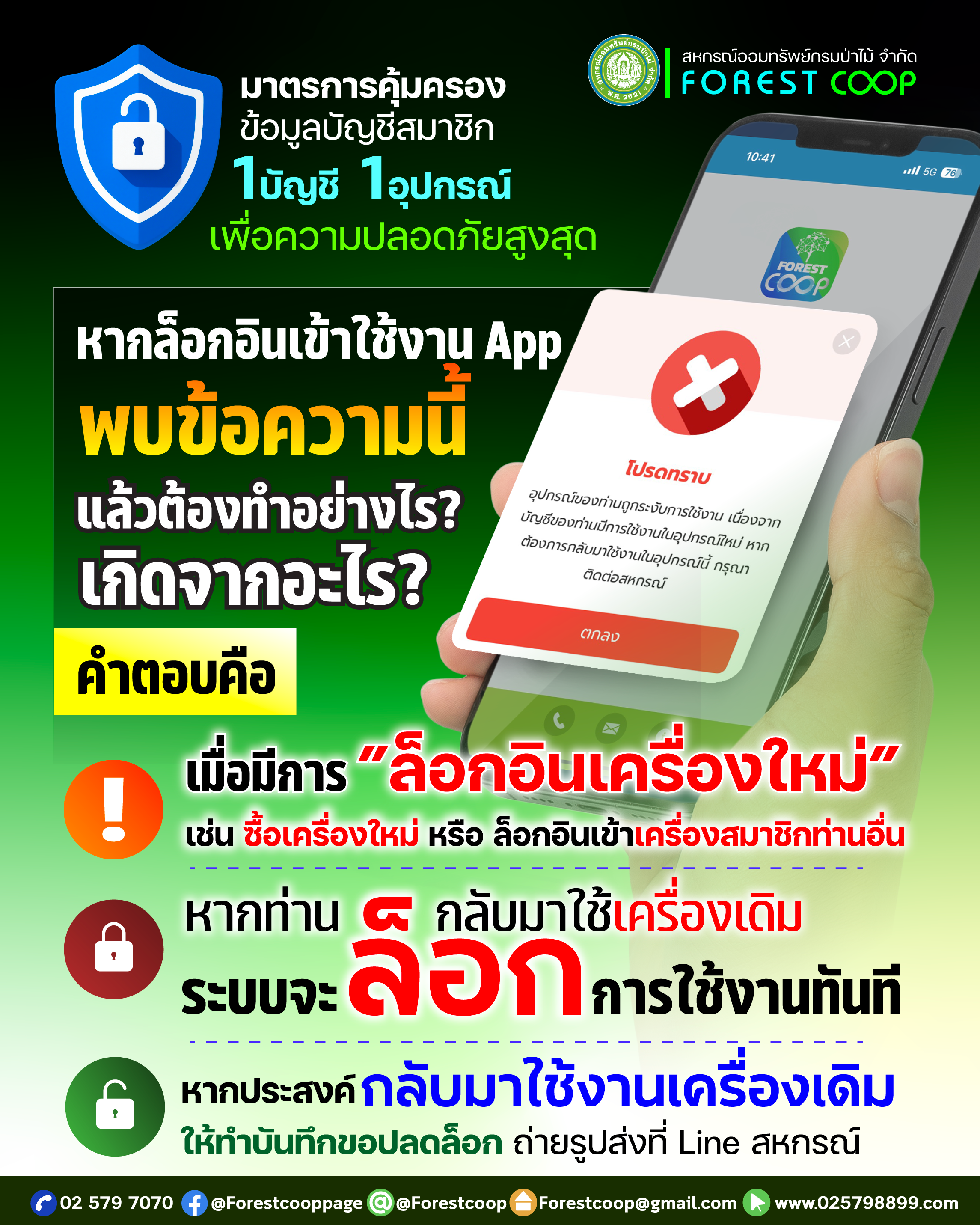 นื่องจากระบบแอปพลิเคชันของสหกรณ์ได้กำหนดมาตรการด้านความมั่นคงปลอดภัยของข้อมูลและธุรกรรมทางการเงินของสมาชิก จึงกำหนดให้ 1 บัญชี สามารถใช้งานได้ 1 อุปกรณ์เท่านั้น เพื่อยกระดับความปลอดภัยสูงสุด อ่านเพิ่มเติม