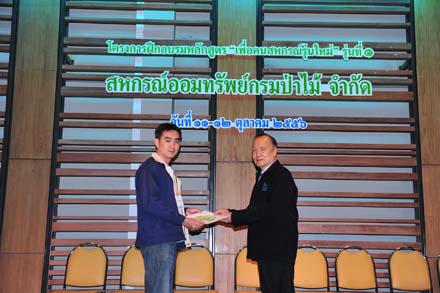นายสิทธิชัย อึ๊งภากรณ์ ประธานกรรมการดำำเนินการสหกรณ์ออมทรัพย์กรมป่าไม้ จำกัด กล่าวปิดการฝึกอบรม หลักสูตรเพื่อคนสหกรณ์รุ่นใหม่ และมอบวุฒิบัตรให้กับผู้เข้าร่วมฝึกอบรม